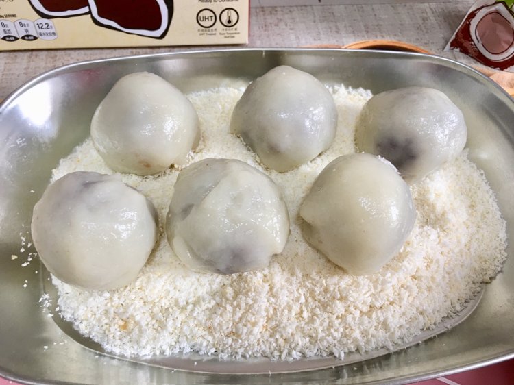 9、包好後放入椰蓉盤中,全身裹滿椰蓉即可。