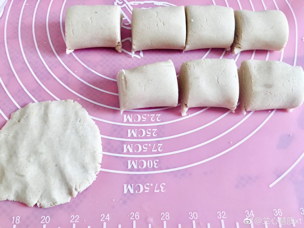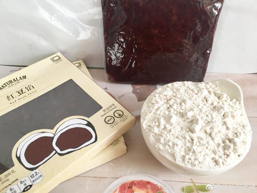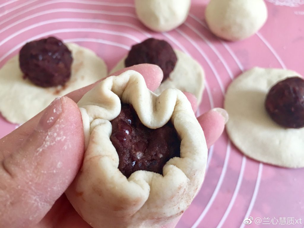 3.面劑用手按壓成餅,放入豆沙餡包住,滾成球狀。
