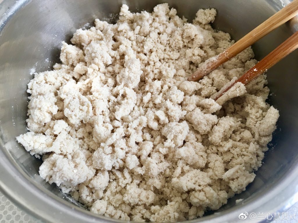 1.粘玉米面用沸水攪拌成疙瘩狀,涼涼後活成面團醒二十分鍾。