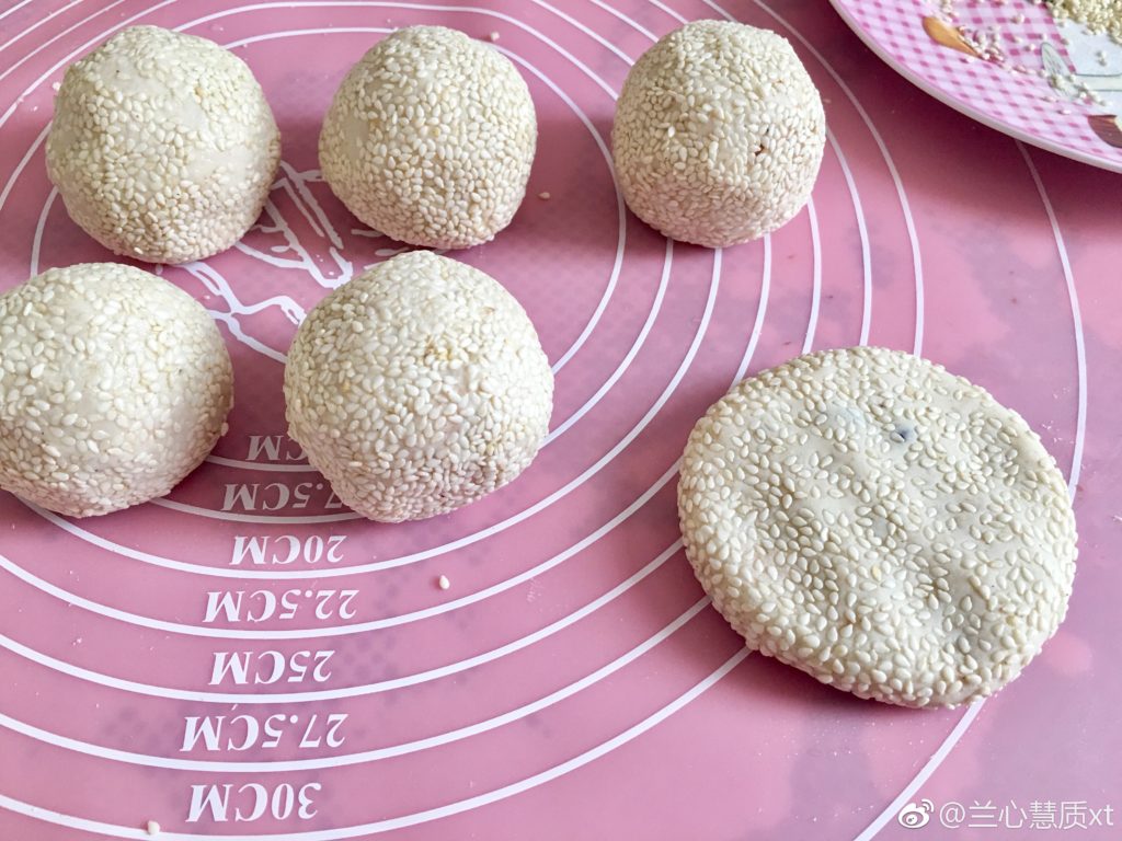 材料:粘玉米面、紅豆沙餡兒、白芝麻。