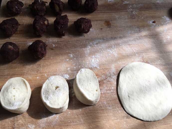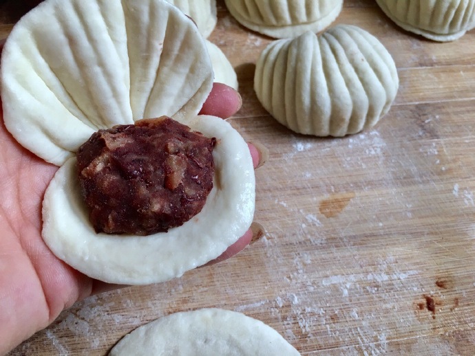 5、放入豆沙餡兒,邊部用清水塗抹,便于二發時兩片合攏。