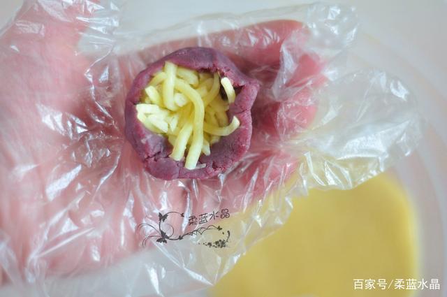 7.將紫薯餡壓成小碗狀。將7克馬蘇裏拉芝士塞入,封口揉圓。
