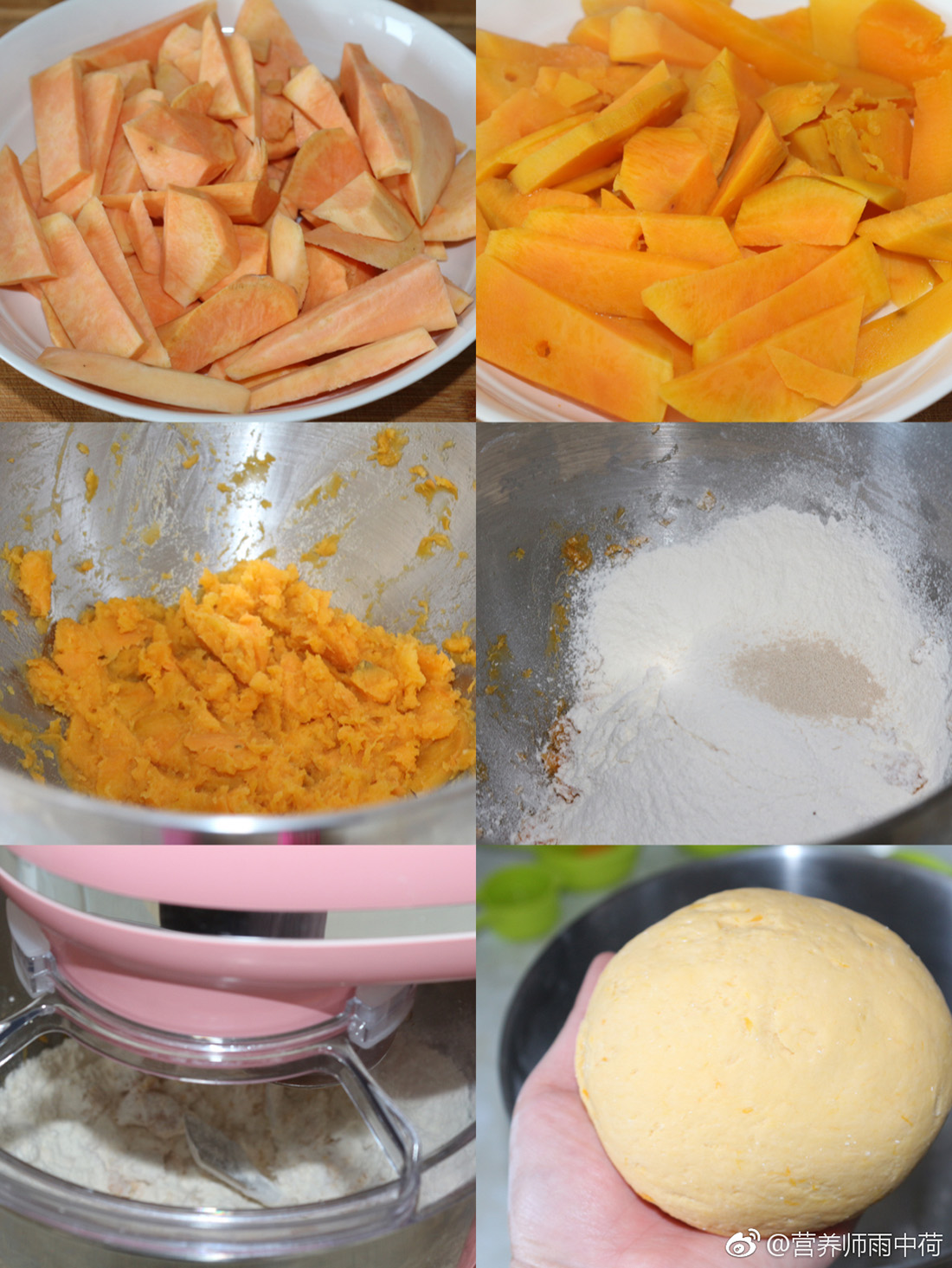 1、紅薯洗淨,切片上鍋蒸熟,拿出後放在廚師機內攪拌成泥;