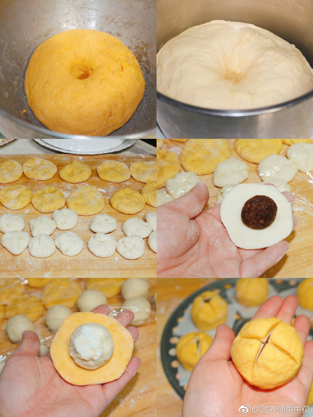 8、拿起白面團將豆餡包好,再用黃色面團將白色面團包好;