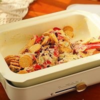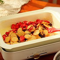 7、把混合好的餅幹堅果蔓越莓草莓幹倒入鍋裏。