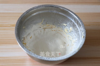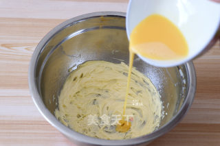 5.取20g蛋液分三次倒入到黃油中,每一次都要用打蛋器攪打均勻後再倒下一次的蛋液;