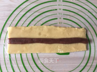 9.將冷藏好的面團擀開擀薄,厚度根據自己的喜好來,放入冷卻好的香芋餡,如圖所示;