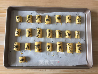 10.卷起來再切成小段,一一擺入烤盤中,刷上剩余的蛋液撒上黑芝麻;