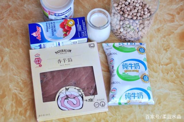 配料:香芋餡30g 、牛奶250g 、珍珠6g 、淡奶油10g、 煉乳15g 、雙皮奶30g