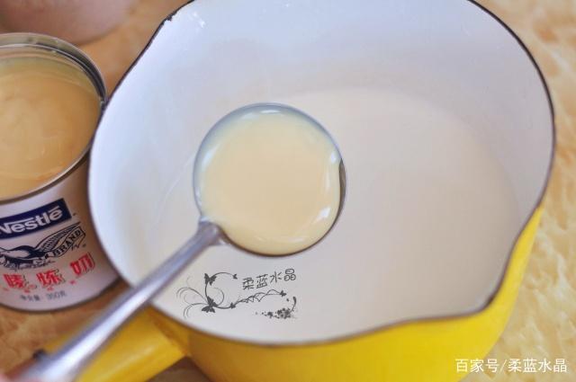 5.牛奶裏加入煉乳,加熱至牛奶微熱,將煉乳融化。