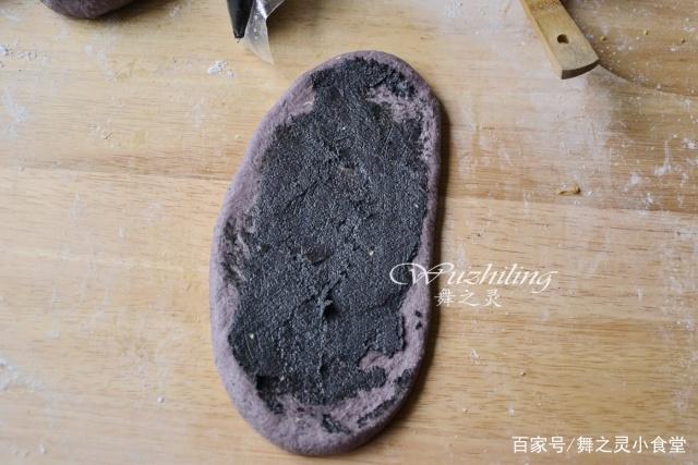 3、發酵好後,排氣分成3份,松弛好再擀成橢圓形,然後抹上黑芝麻醬,薄薄的一層就夠了。