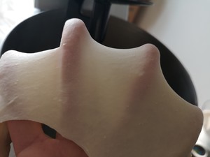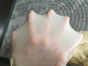 2、二檔和三檔交替,至面團可以拉出有韌性的薄膜。面團放溫暖的地方發酵。