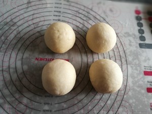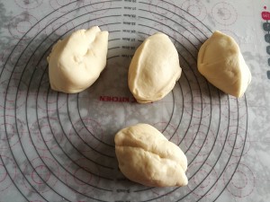 3、面團發酵至用筷子紮面團不塌陷,小洞不回縮。用手掌壓扁排氣,分成四份。