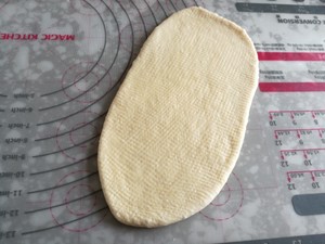 5、取其中一份擀開成舌狀。長度大約27到28厘米左右,寬7~8厘米。