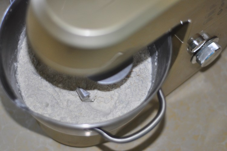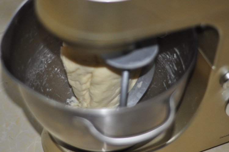 4、再轉至二檔揉面成團能拉出大的膜放入鹽和軟化的黃油繼續揉至完全。在26-28度左右發酵至兩倍大。