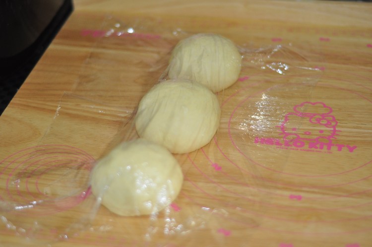 5、取出一發好的面團輕按排氣,分成中間略重兩邊均等的三個面團滾圓蓋上保鮮膜醒十五分鍾。依次取出擀長卷起再次醒十分鍾。