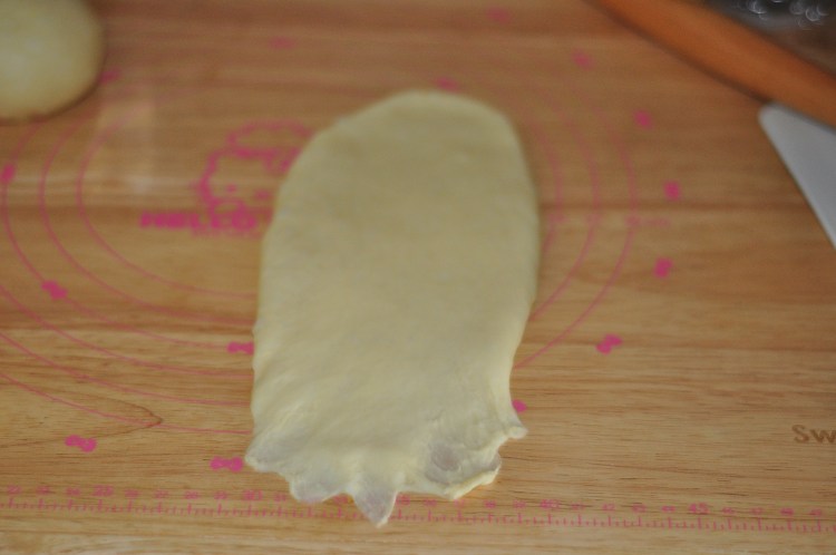 6、取出中間略重的面卷擀長。