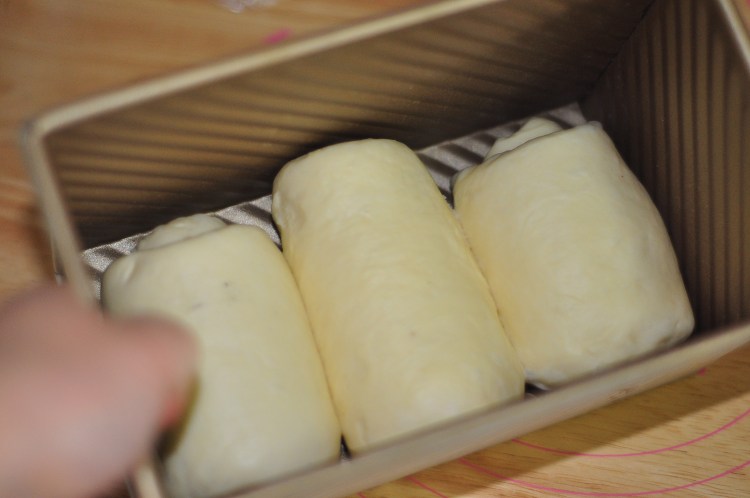 8、卷起放入吐司盒中,兩邊面團依次完成放入。