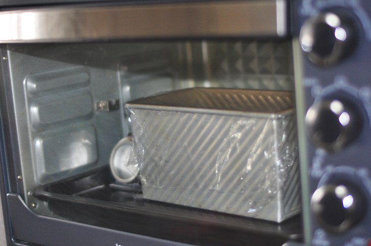 9、蓋上保鮮膜放烤箱35-38度左右醒發至吐司盒八分滿。