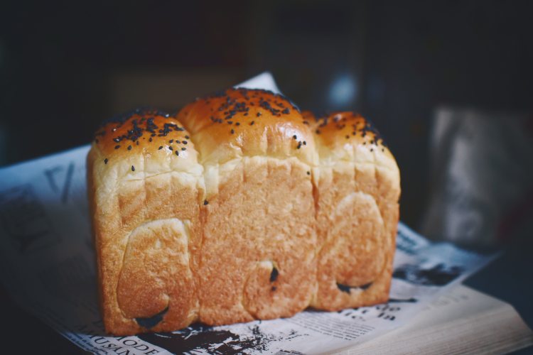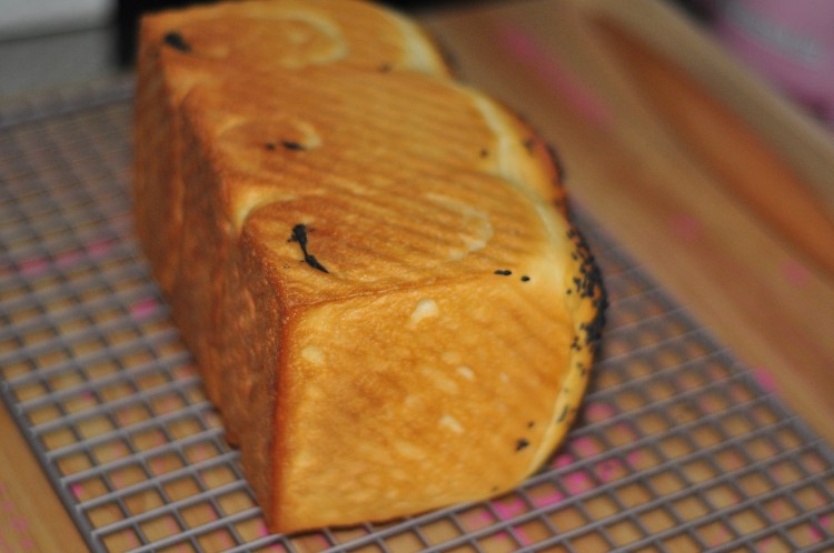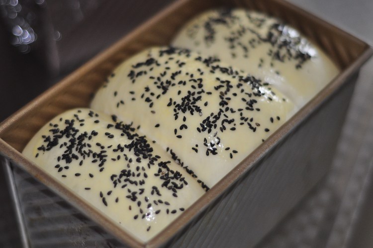10、取出吐司生胚,刷上蛋液撒上黑芝麻。