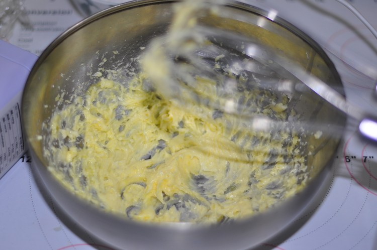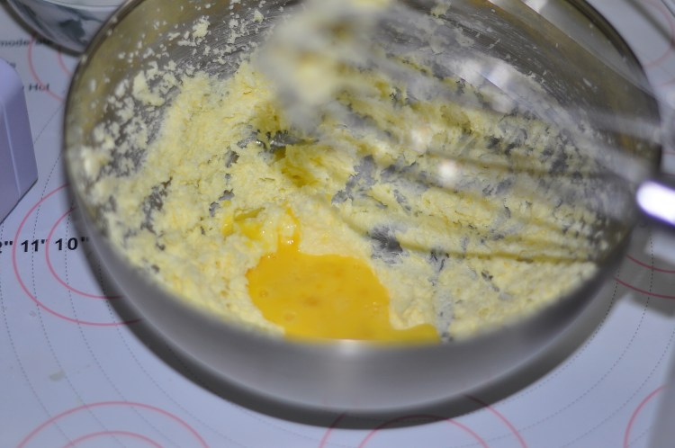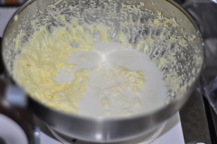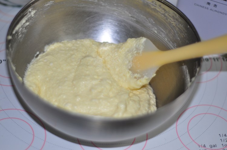 4、分次加入打散的蛋液攪打至完全融合,不要出現油水分離的情況。