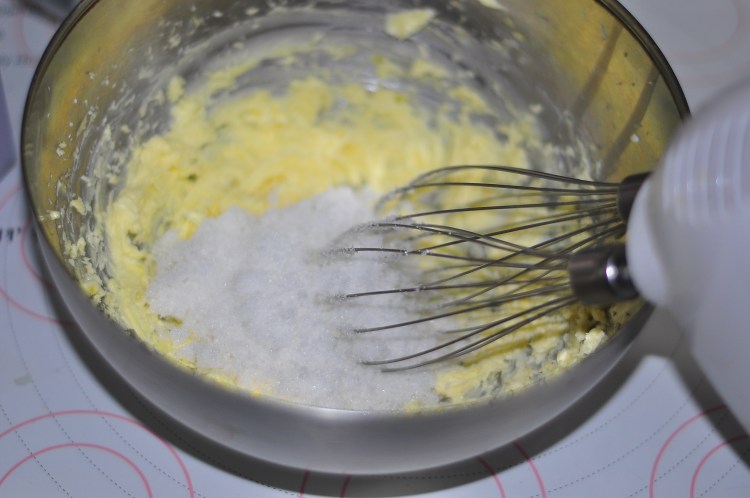 3、放入糖和鹽,繼續攪打至顔色略淺,體積膨大。