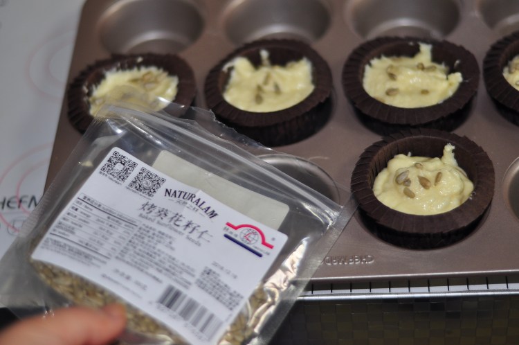 輔料:糖60g、鹽1g、蛋液50g、黃油60g、鮮奶90g、天然之林瓜子仁適量、杏仁片少許、泡打粉2.5g