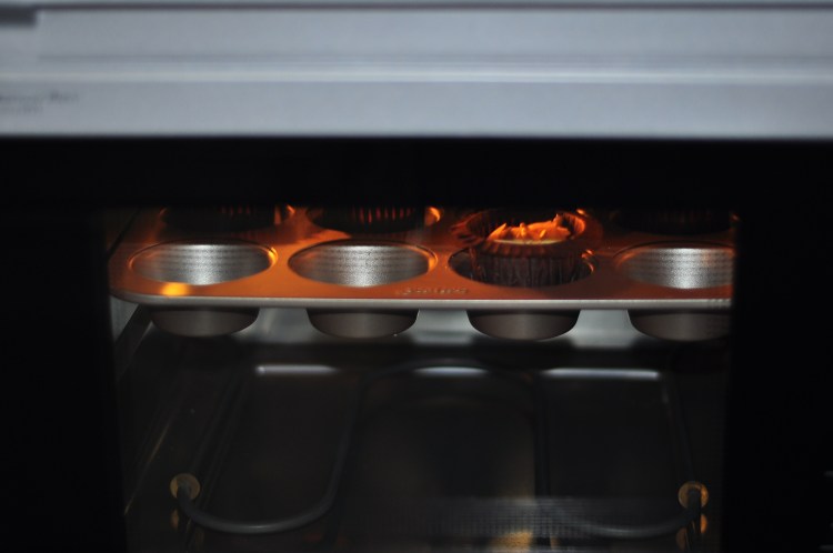 8、將面糊倒入小蛋糕的紙杯中八分滿即可。